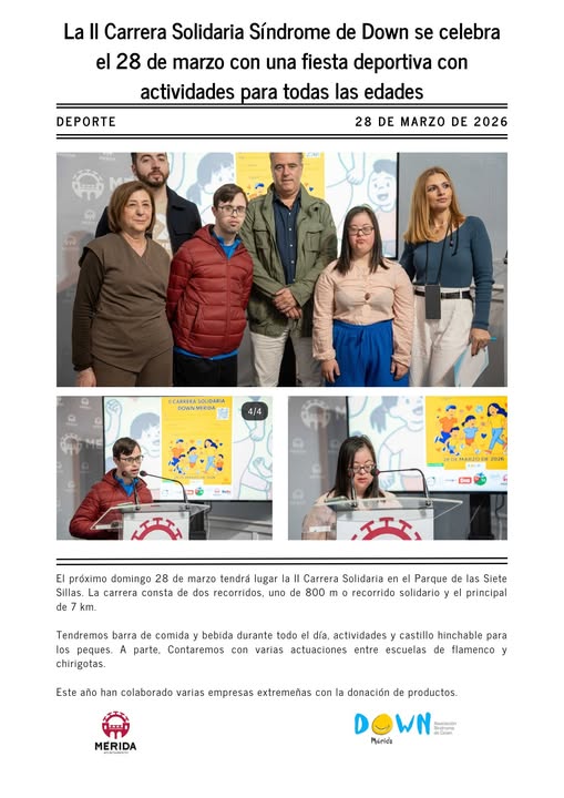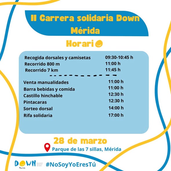 La II Carrera Solidaria de Down Mérida se celebrará el próximo 28 de Marzo. Tendrá lugar en el Parque de las Siete Sillas.