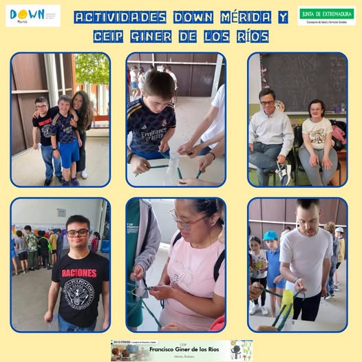 Down Mérida colabora con el CEIP Giner de los Ríos en la celebración de su día del centro, realizando actividades lúdicas e inclusivas llevadas a cabo por personas con Síndrome de Down y otras Discapacidades.