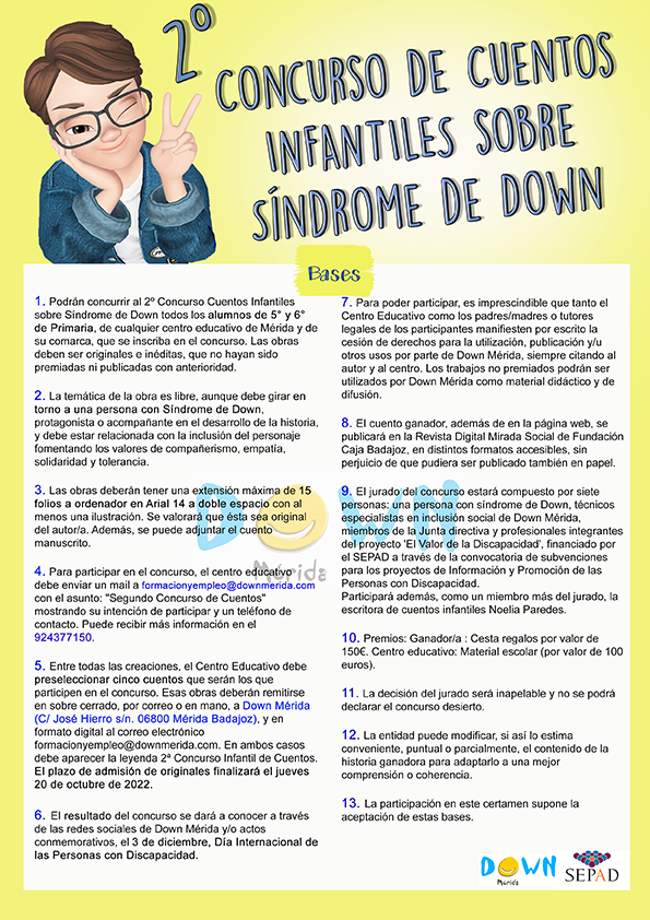 Las otras dos novedades son que, en este 2022, los alumnos participantes deben pertenecer a quinto y sexto de primaria, con la intención de reducir las diferencias entre el nivel de expresión, vocabulario y narración que pueda producirse con alumnos de cursos inferiores y que cada centro escolar que opte al concurso debe preseleccionar un máximo de cinco cuentos que deberá enviar a Down Mérida en formato digital y/o por correo ordinario.