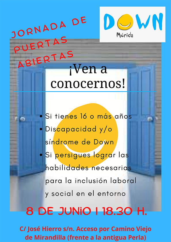 Down Mérida celebra unas jornadas de puertas abiertas dirigidas a jóvenes con síndrome de Down u otra discapacidad para dar a conocer sus actividades y programas Será el próximo 8 de junio a partir de las 18.30 y serán los propios chicos de la entidad los que expliquen los programas y las actividades que se realizan