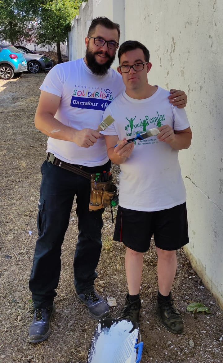 Empleados de Carrefour Mérida habilitan un espacio lúdico en el exterior de Down Mérida. Forma parte de la iniciativa ‘Día de la Buena Gente’ que la firma organiza anualmente. Antes de esta intervención, los alumnos de la Escuela Profesional Barraeca y la delegación de Policía Local y Seguridad Ciudadana de Ayuntamiento acondicionaron el entorno para hacerlo más seguro .